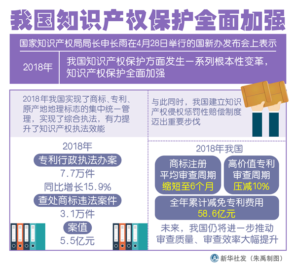 新華社北京4月28日電(記者張泉)國家知識(shí)產(chǎn)權(quán)局局長申長雨在28日舉行的國新辦發(fā)布會(huì)上表示,2018年,我國知識(shí)產(chǎn)權(quán)保護(hù)方面發(fā)生一系列根本性變革,知識(shí)產(chǎn)權(quán)保護(hù)全面加強(qiáng)。