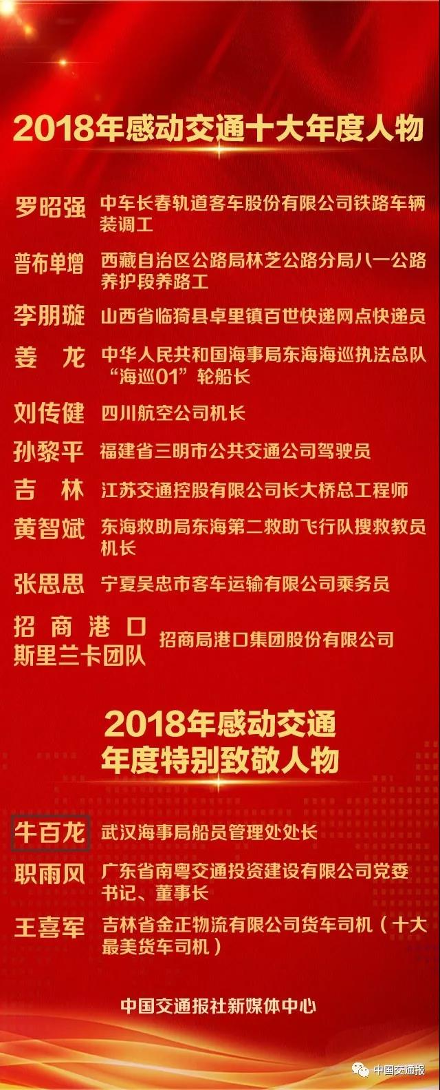 另外,將青春和生命奉獻(xiàn)給海事交通事業(yè)的武漢海事局船員管理處處長(zhǎng)牛百龍;胸懷大愛,積極踐行“大道為公”理念的廣東南粵交通投資建設(shè)有限公司黨委書記、董事長(zhǎng)職雨風(fēng);400萬公里安全駕駛、細(xì)心工作、熱心助人的吉林省物流貨車司機(jī)王喜軍榮獲“2018年感動(dòng)交通年度特別致敬人物”稱號(hào)。