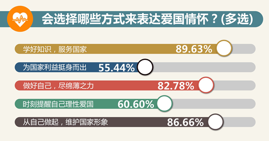 大學(xué)生表達(dá)愛國的方式更加務(wù)實,94.03%的受訪者認(rèn)為“理性愛國是最好的方式”。超過80%的大學(xué)生認(rèn)為愛國要先從自己做起,“學(xué)好知識、服務(wù)國家”“做好自己,為社會盡綿薄之力”等成為很多大學(xué)生的首選。陜西師范大學(xué)學(xué)生強(qiáng)德平說,愛國有三點(diǎn),第一是銘記歷史,第二是展望未來,第三是把握當(dāng)下。中國人民大學(xué)學(xué)生張嘯寒說,走到人民生產(chǎn)實踐的第一線,是關(guān)心國家和社會的最好方式。