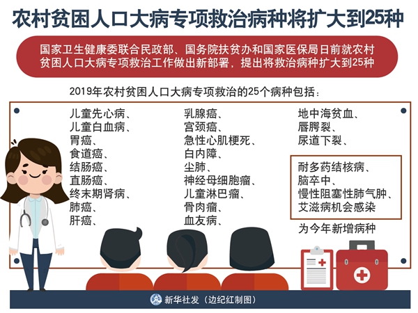 記者從國家衛(wèi)健委獲悉,2019年農(nóng)村貧困人口大病專項(xiàng)救治的25個病種包括:兒童先心病、兒童白血病、胃癌、食道癌、結(jié)腸癌、直腸癌、終末期腎病、肺癌、肝癌、乳腺癌、宮頸癌、急性心肌梗死、白內(nèi)障、塵肺、神經(jīng)母細(xì)胞瘤、兒童淋巴瘤、骨肉瘤、血友病、地中海貧血、唇腭裂、尿道下裂、耐多藥結(jié)核病、腦卒中、慢性阻塞性肺氣腫、艾滋病機(jī)會感染。其中,后四種為今年新增病種。