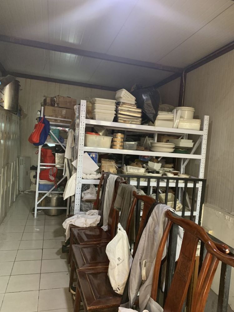 致美齋三樓餐具倉(cāng)庫(kù)同時(shí)為員工更衣室,餐具與員工衣物堆放在一起。圖片來(lái)源:新華社客戶端