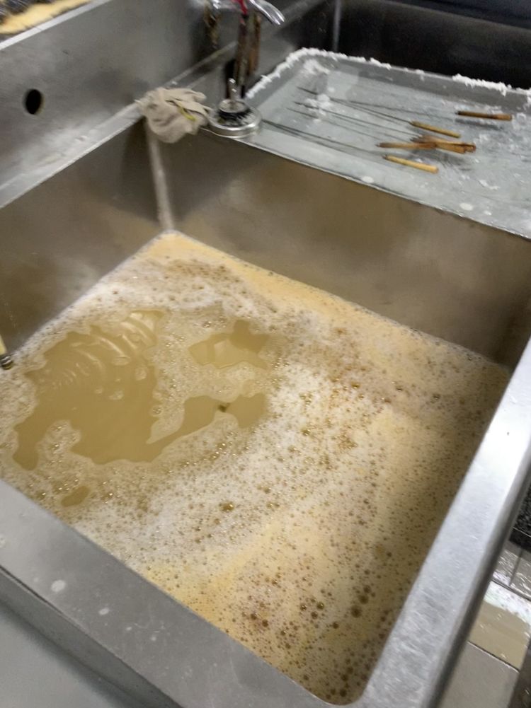 一樓洗碗間,已經(jīng)被油污污染發(fā)黃的洗潔精水池。圖片來(lái)源:新華社客戶端