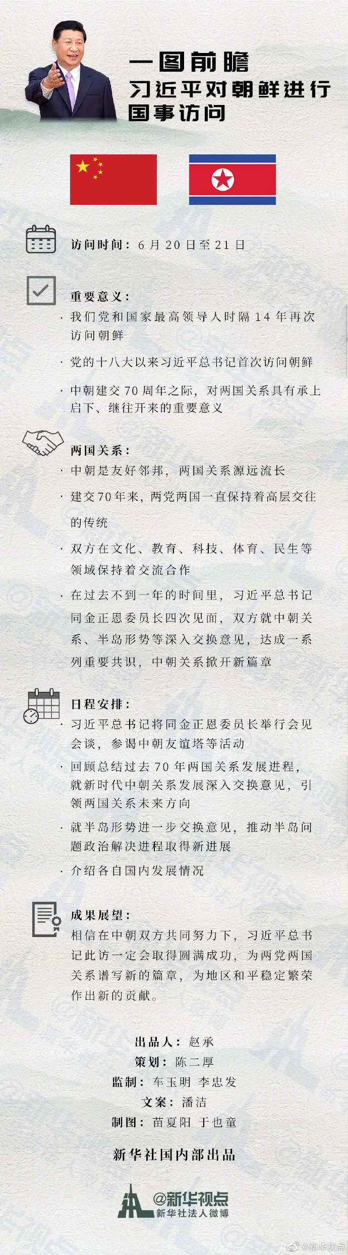 新華社北京6月17日電 中共中央對外聯(lián)絡(luò)部發(fā)言人胡兆明17日在北京宣布:應朝鮮勞動黨委員長、朝鮮民主主義人民共和國國務(wù)委員會委員長金正恩邀請,中共中央總書記、中華人民共和國主席習近平將于6月20日至21日對朝鮮民主主義人民共和國進行國事訪問。