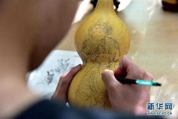 午后陽(yáng)光和煦,聽(tīng)障生創(chuàng)新創(chuàng)業(yè)工作室里,來(lái)自貴州的徐崇瑞手持鉛筆,在一個(gè)嶄新的葫蘆上勾勒年畫(huà),筆法細(xì)膩,有條不紊。身后的書(shū)架上整齊擺放著他們制作的葫蘆烙畫(huà)、手工皮包、糧食鑲嵌畫(huà)等作品。