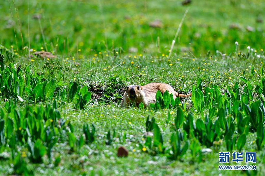 這是在青海省玉樹藏族自治州雜多縣昂賽鄉(xiāng)境內(nèi)拍攝的旱獺(6月21日攝)。新華社記者 張龍 攝