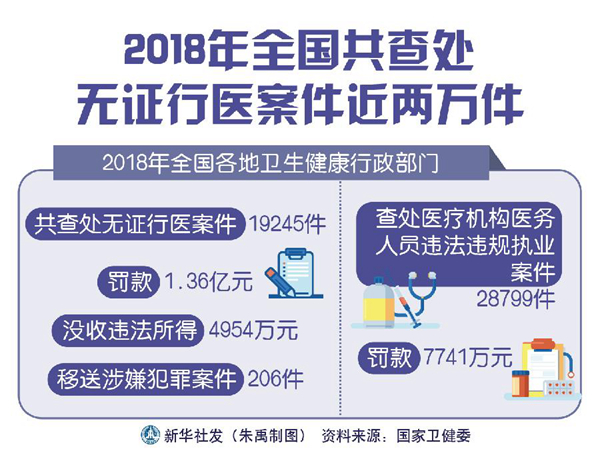 新華社北京6月25日電(記者王秉陽)國(guó)家衛(wèi)健委近日公布,2018年全國(guó)各地衛(wèi)生健康行政部門共查處無證行醫(yī)案件19245件,罰款1.36億元,沒收違法所得4954萬元,移送涉嫌犯罪案件206件;查處醫(yī)療機(jī)構(gòu)醫(yī)務(wù)人員違法違規(guī)執(zhí)業(yè)案件28799件,罰款7741萬元。