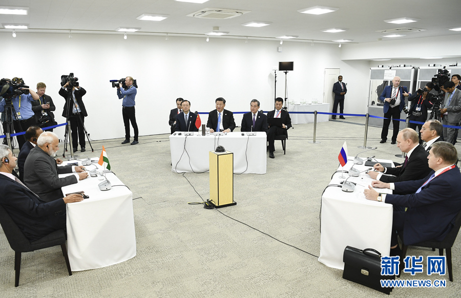 6月28日,國(guó)家主席習(xí)近平在大阪出席中俄印領(lǐng)導(dǎo)人會(huì)晤,同俄羅斯總統(tǒng)普京、印度總理莫迪就當(dāng)前國(guó)際形勢(shì)、重大國(guó)際和地區(qū)問(wèn)題、三方合作深入交換意見。 新華社記者 謝環(huán)馳 攝