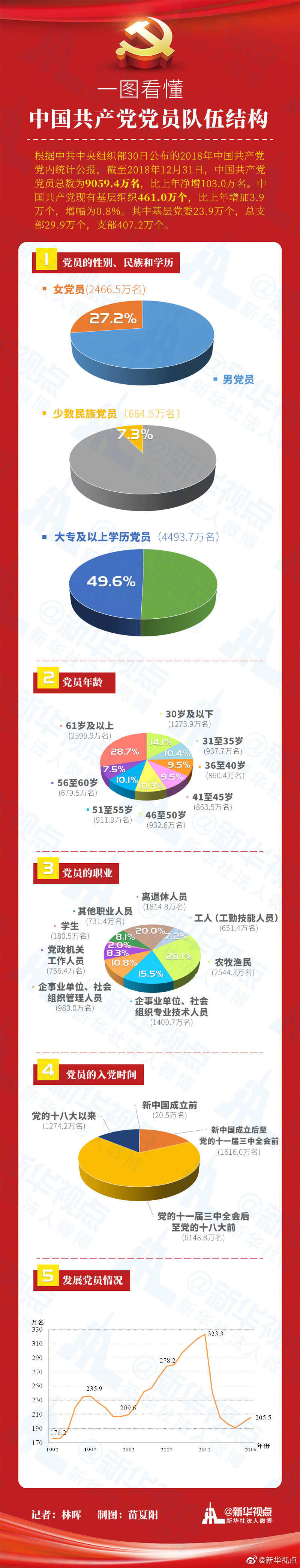 根據(jù)中共中央組織部30日公布的2018年中國(guó)共產(chǎn)黨黨內(nèi)統(tǒng)計(jì)公報(bào),截至2018年12月31日,中國(guó)共產(chǎn)黨黨員總數(shù)為9059.4萬(wàn)名。想了解黨員的性別比例、學(xué)歷情況、職業(yè)分布……戳圖? ????