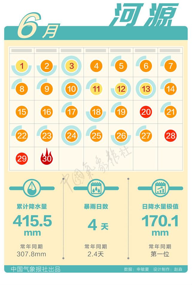 河源:廣東河源6月累計(jì)降水量達(dá)415.5毫米,比常年同期307.8毫米偏多近35%,30天中有23天在下雨,其中暴雨日數(shù)為4天,比常年同期2.4天偏多。日降水極值170.1毫米打破歷史記錄極值。(專家顧問:舒文軍 馬悅 蘇軼 高帆 蔣運(yùn)志 李蒙 單雪珂 記者 申敏夏)