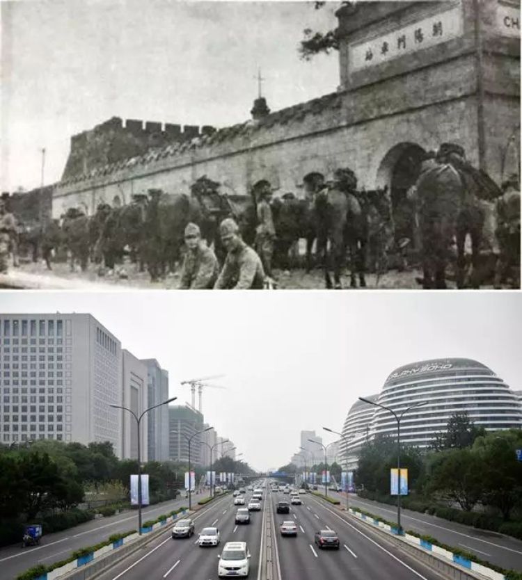 上圖為1937年8月8日,日本騎兵在朝陽(yáng)門車站集結(jié)(資料照片);下圖為2017年7月3日拍攝的朝陽(yáng)門地區(qū)(新華社記者 張晨霖 攝)。