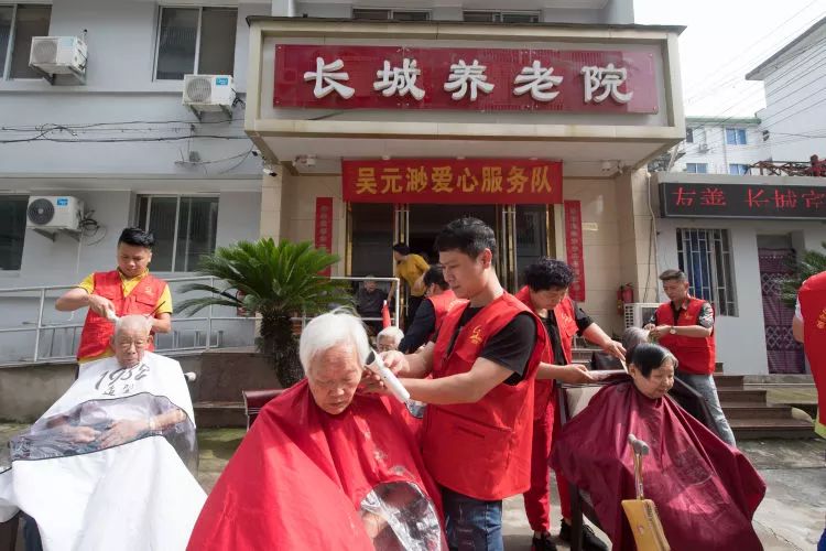 吳元渺愛心服務(wù)隊(duì)的志愿者們?cè)谂R海市一家養(yǎng)老院為老人義務(wù)理發(fā)。