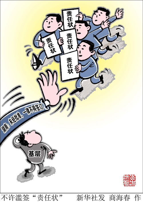 一味問責(zé)導(dǎo)致部分基層干部“虱多不癢、債多不愁”。一名基層干部向半月談記者傾訴:自己跑到縣里一個會場,“埋頭就在一沓責(zé)任狀上簽字,也不看是關(guān)于什么內(nèi)容,反正出了事責(zé)任都在鄉(xiāng)鎮(zhèn)”。他以該省新出臺的一份關(guān)于防控兒童青少年近視的文件舉例說,里面仍然要求“省與市簽責(zé)任書,市以下政府逐級簽責(zé)任書”。