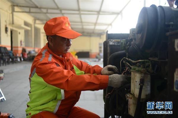 青海省湟源公路段湟源工區(qū)職工方萬品在車間內(nèi)檢修發(fā)電機(7月29日攝)。新華社發(fā)(王浡 攝)