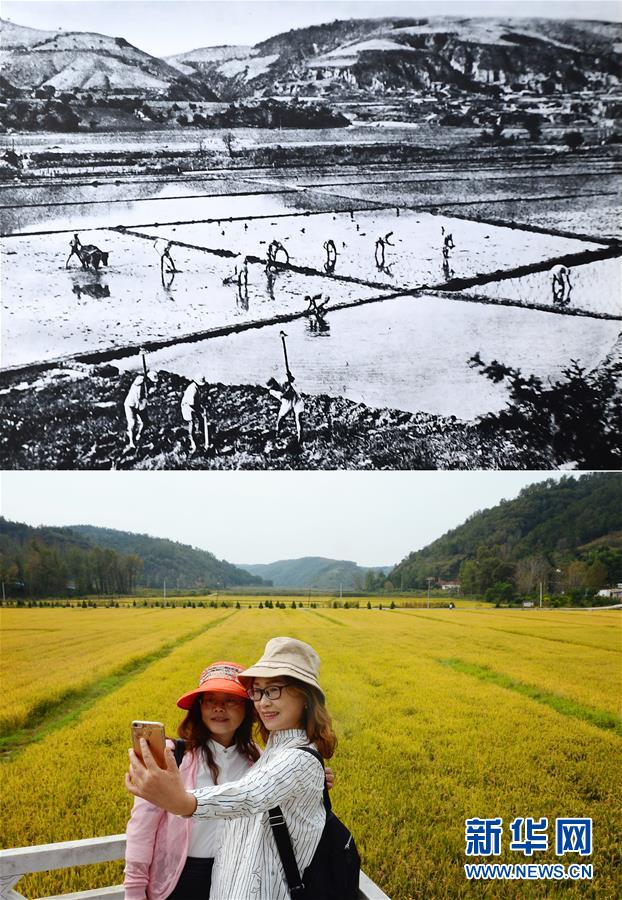 這是一張拼版照片,上圖為抗戰(zhàn)時(shí)期延安南泥灣的生產(chǎn)場景(資料圖片);下圖為2018年9月12日,游客在延安南泥灣稻田旁留影(新華社記者劉瀟攝)。新華社發(fā)