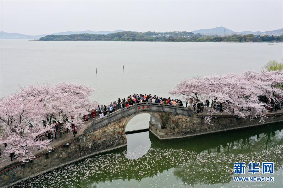 游客在江蘇無錫太湖黿頭渚風(fēng)景區(qū)內(nèi)賞櫻(4月2日無人機(jī)拍攝)。新華社記者 李博 攝