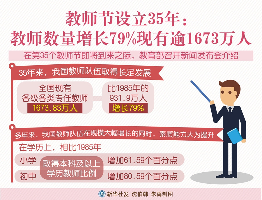 新華社北京9月3日電(記者 胡浩)在第35個(gè)教師節(jié)即將到來之際,教育部召開新聞發(fā)布會(huì)介紹,35年來,我國教師隊(duì)伍取得長足發(fā)展。全國現(xiàn)有各級(jí)各類專任教師1673.83萬人,比1985年的931.9萬人增長79%。