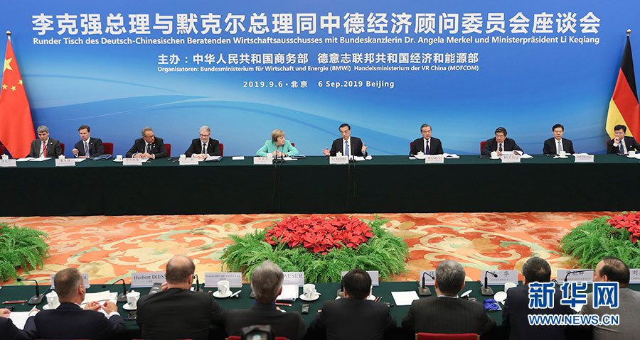 9月6日,國(guó)務(wù)院總理李克強(qiáng)在北京人民大會(huì)堂與德國(guó)總理默克爾共同出席中德經(jīng)濟(jì)顧問(wèn)委員會(huì)座談會(huì),并同與會(huì)代表交流。 新華社記者 丁海濤 攝