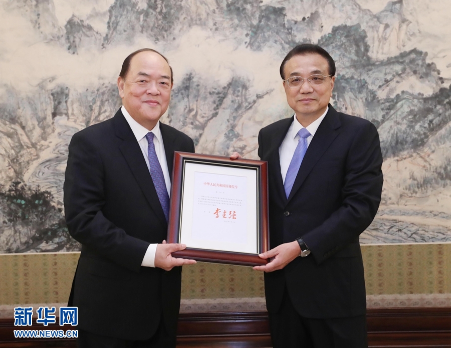 9月11日,國務(wù)院總理李克強(qiáng)在北京中南海紫光閣會見賀一誠,頒發(fā)任命他為中華人民共和國澳門特別行政區(qū)第五任行政長官的國務(wù)院第719號令。 新華社記者 劉衛(wèi)兵 攝