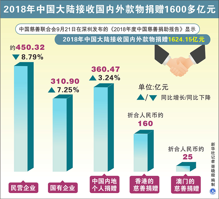 新華社深圳9月21日電(記者王豐、李曉玲)中國慈善聯(lián)合會21日在深圳發(fā)布的《2018年度中國慈善捐助報告》顯示,2018年中國大陸接收國內外款物捐贈1624.15億元。