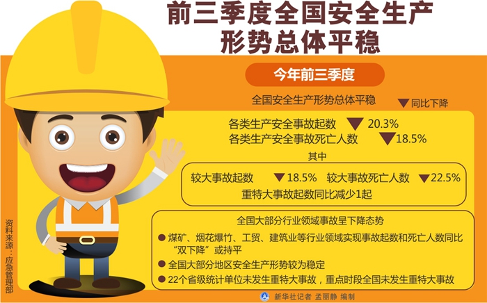 應(yīng)急管理部有關(guān)負(fù)責(zé)人表示,前三季度,全國大部分行業(yè)領(lǐng)域事故呈下降態(tài)勢。煤礦、煙花爆竹、工貿(mào)、建筑業(yè)等行業(yè)領(lǐng)域?qū)崿F(xiàn)事故起數(shù)和死亡人數(shù)同比“雙下降”或持平。全國大部分地區(qū)安全生產(chǎn)形勢較為穩(wěn)定。22個省級統(tǒng)計單位未發(fā)生重特大事故,重點時段全國未發(fā)生重特大事故。