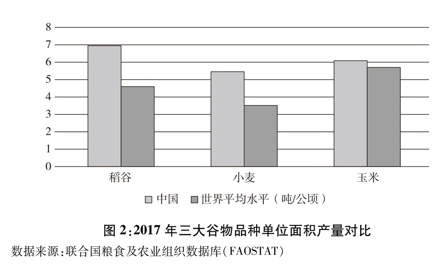 ——單產顯著提高。2010年平均每公頃糧食產量突破5000公斤。2018年達到5621公斤,比1996年的4483公斤增加了1138公斤,增長25%以上。2017年稻谷、小麥、玉米的每公頃產量分別為6916.9公斤、5481.2公斤、6110.3公斤,較1996年分別增長11.3%、46.8%、17.4%,比世界平均水平分別高50.1%、55.2%、6.2%。