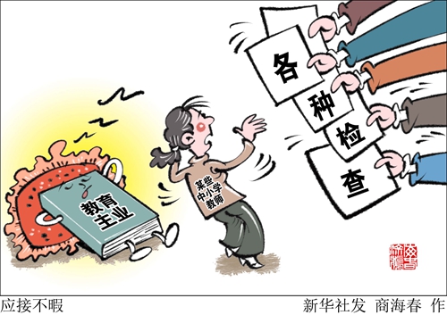 事實(shí)上,早在今年3月中辦就發(fā)布《關(guān)于解決形式主義突出問題為基層減負(fù)的通知》,強(qiáng)調(diào)今年要解決一些困擾基層的形式主義問題,切實(shí)為基層減負(fù)。“新華視點(diǎn)”記者近日調(diào)查發(fā)現(xiàn),在一些地方的中小學(xué),各種檢查以及與教學(xué)無關(guān)的活動紛紛進(jìn)校園,令教師們不堪重負(fù)甚至影響了教學(xué)工作。