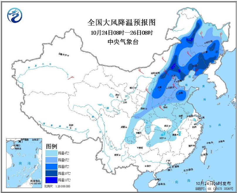而今天起,冷空氣將會(huì)繼續(xù)南下逐步影響中東部地區(qū),中央氣象臺(tái)預(yù)計(jì),10月24日08時(shí)至26日08時(shí),西北地區(qū)東部、東北大部、華北、黃淮、江淮、四川盆地、湖北西部和東部、湖南北部、江西西北部等地的部分地區(qū)氣溫將下降4~8℃,其中內(nèi)蒙古中部偏東和東北部、東北地區(qū)東南部等地的部分地區(qū)降溫可達(dá)10℃以上,并伴有4~6級(jí)偏北風(fēng)、陣風(fēng)7~8級(jí)。
