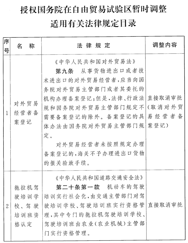 為進(jìn)一步優(yōu)化營(yíng)商環(huán)境,激發(fā)市場(chǎng)活力和社會(huì)創(chuàng)造力,加快政府職能轉(zhuǎn)變,第十三屆全國(guó)人民代表大會(huì)常務(wù)委員會(huì)第十四次會(huì)議決定:授權(quán)國(guó)務(wù)院在自由貿(mào)易試驗(yàn)區(qū)內(nèi),暫時(shí)調(diào)整適用《中華人民共和國(guó)對(duì)外貿(mào)易法》《中華人民共和國(guó)道路交通安全法》《中華人民共和國(guó)消防法》《中華人民共和國(guó)食品安全法》《中華人民共和國(guó)海關(guān)法》《中華人民共和國(guó)種子法》的有關(guān)規(guī)定(目錄附后)。上述調(diào)整在三年內(nèi)試行。對(duì)實(shí)踐證明可行的,國(guó)務(wù)院應(yīng)當(dāng)提出修改有關(guān)法律的意見(jiàn);對(duì)實(shí)踐證明不宜調(diào)整的,在試點(diǎn)期滿后恢復(fù)施行有關(guān)法律規(guī)定。