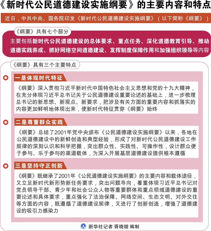 《綱要》具有三個(gè)主要特點(diǎn):一是體現(xiàn)時(shí)代特征?!毒V要》深入貫徹習(xí)近平新時(shí)代中國特色社會(huì)主義思想和黨的十九大精神,在充分體現(xiàn)習(xí)近平總書記關(guān)于公民道德建設(shè)重要論述的基礎(chǔ)上,進(jìn)一步梳理總書記的新思想、新觀點(diǎn)、新要求,把涉及有關(guān)方面的重要內(nèi)容和抓落實(shí)的內(nèi)容更加鮮明地體現(xiàn)出來,使新時(shí)代特征貫穿《綱要》始終。二是尊重群眾實(shí)踐?!毒V要》總結(jié)了2001年黨中央頒布《公民道德建設(shè)實(shí)施綱要》以來,各地在公民道德建設(shè)中的新鮮創(chuàng)造和典型經(jīng)驗(yàn),形成了對(duì)新時(shí)代公民道德建設(shè)工作規(guī)律的深刻認(rèn)識(shí)和科學(xué)把握,突出群眾性、實(shí)踐性、可操作性,設(shè)計(jì)群眾便于參與、樂于參與的渠道載體,為深入開展基層道德建設(shè)提供根本遵循。三是堅(jiān)持守正創(chuàng)新?!毒V要》既繼承了2001年《公民道德建設(shè)實(shí)施綱要》的主要內(nèi)容和載體途徑,又立足新時(shí)代新形勢(shì)新任務(wù)要求,突出問題導(dǎo)向,著重體現(xiàn)習(xí)近平總書記對(duì)黨員領(lǐng)導(dǎo)干部、青少年和社會(huì)公眾人物等重要群體和重點(diǎn)領(lǐng)域道德建設(shè)的重要論述和具體要求,重點(diǎn)強(qiáng)化了法治保障、網(wǎng)絡(luò)空間、生態(tài)文明、對(duì)外交往等方面的內(nèi)容,既遵循了道德建設(shè)規(guī)律,又進(jìn)行了創(chuàng)新創(chuàng)造,增強(qiáng)了道德建設(shè)的吸引力感染力。