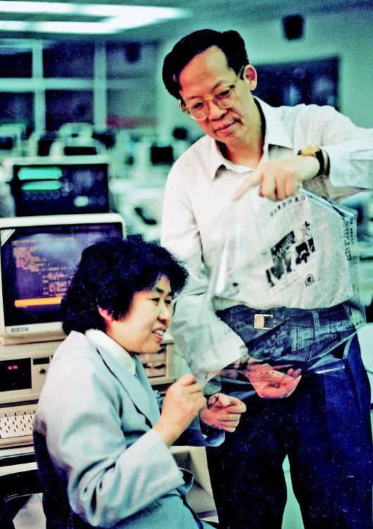 王選正在查看用激光照排系統(tǒng)輸出的報(bào)紙膠片(1991年攝)。
