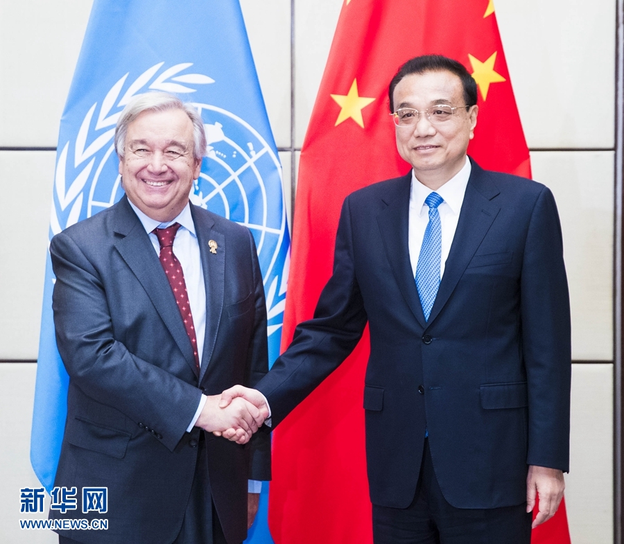 11月3日,國務(wù)院總理李克強在曼谷會見聯(lián)合國秘書長古特雷斯。 新華社記者 黃敬文 攝
