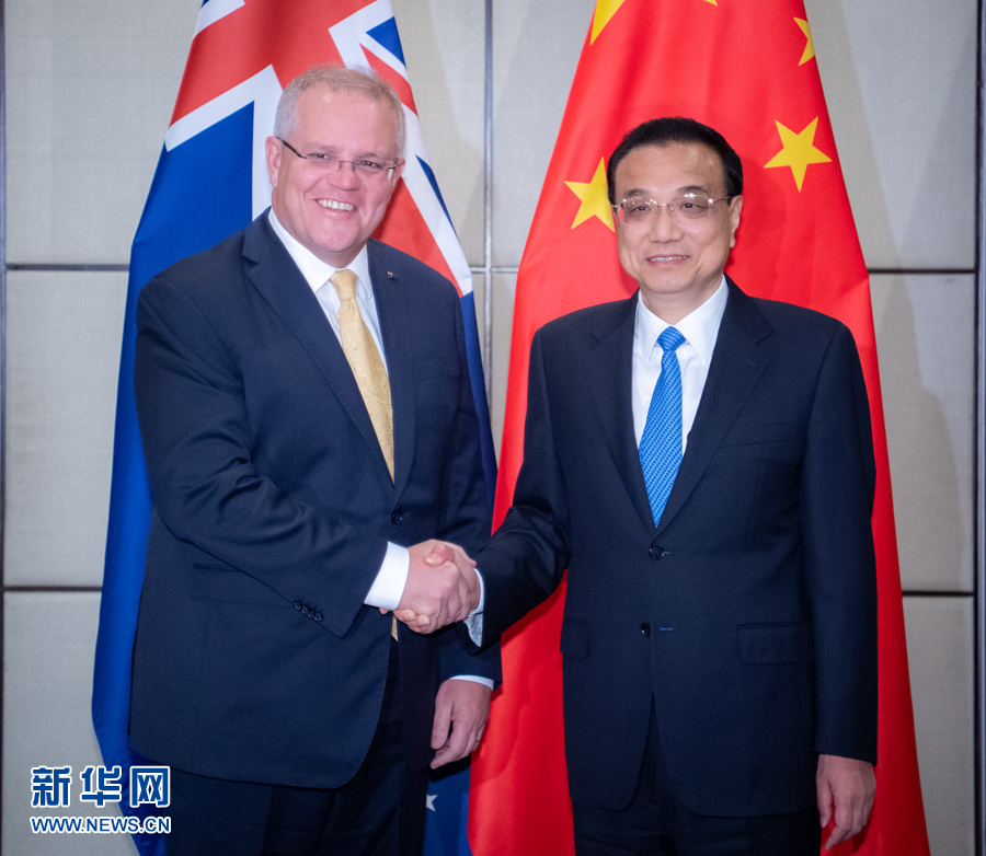 當?shù)貢r間11月3日下午,國務(wù)院總理李克強在曼谷出席東亞合作領(lǐng)導(dǎo)人系列會議期間,同澳大利亞總理莫里森舉行第七輪中澳總理年度會晤。 新華社記者翟健嵐攝
