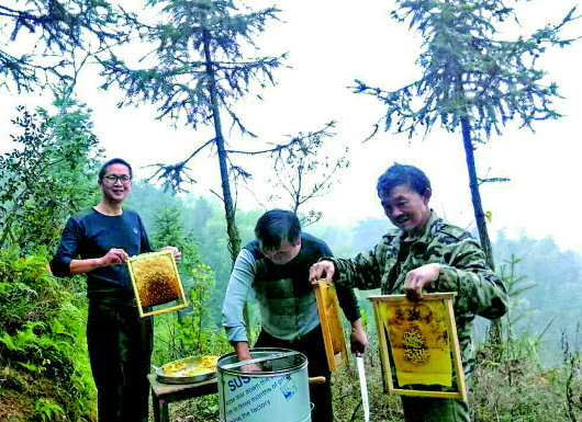 ▲鄧文慧(左一)幫貧困戶收蜂蜜。