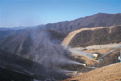 黃白相間的造雪機噴射出美麗的水霧,在空中迅速凝結(jié)為雪。圖片/北京市重大項目辦提供