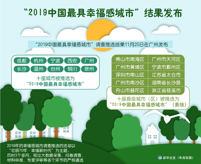 新華社廣州11月26日電(記者荊淮僑、鄧華)“2019中國最具幸福感城市”調(diào)查推選結(jié)果25日在廣州發(fā)布,成都等10個(gè)地級(以上)城市、佛山市南海區(qū)等10個(gè)縣級城市(區(qū))當(dāng)選。