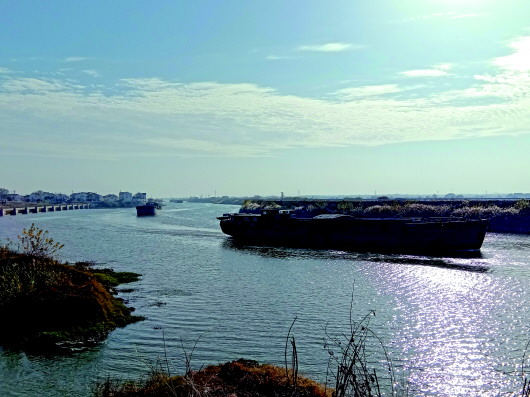 在江蘇省西南角的南京市高淳區(qū),有條古老的人工運(yùn)河——胥河,開鑿至今已2500余年。11月19日傍晚,東壩街道新建的廣通橋沐浴在落日余暉下,幾艘滿載貨物的大鐵船,順胥河?xùn)|下,前方是常州、無(wú)錫、蘇州。波瀾不驚,船上小狗興奮地對(duì)著岸上的人們吠叫。次日晨,記者趕到東壩上游固城街道胥河沿線,又見七八艘大鐵船逶迤逆行西上,指向蕪湖乃至更遠(yuǎn)的地方。水清河寬,天高云淡,心曠神怡。