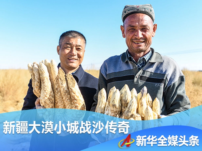 徐寧(左)與新疆且末縣英吾斯塘鄉(xiāng)65歲的村民阿里木·穆沙展示剛剛采挖出來(lái)的肉蓯蓉(11月15日攝)。新華社記者 王菲 攝