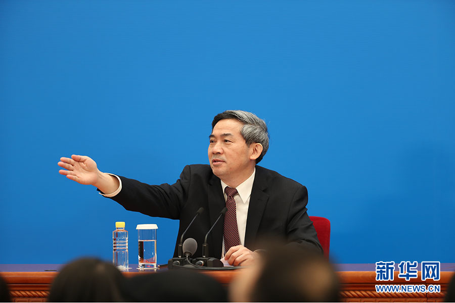 十三屆全國(guó)人大二次會(huì)議3月4日上午11時(shí)15分在人民大會(huì)堂新聞發(fā)布廳舉行新聞發(fā)布會(huì),由大會(huì)發(fā)言人張業(yè)遂就大會(huì)議程和人大工作相關(guān)的問題回答中外記者提問。圖為新聞發(fā)布會(huì)主持人何紹仁。新華網(wǎng)/中國(guó)政府網(wǎng) 陳杰 攝