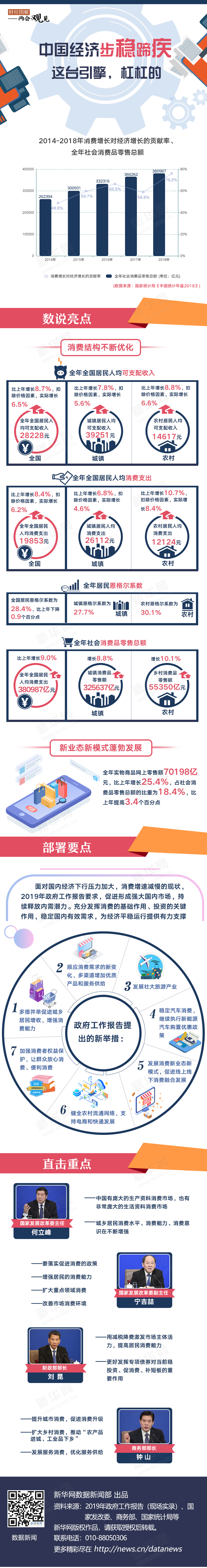 新華網(wǎng)北京3月9日電(劉緒堯 何凡) 2018年消費(fèi)的增長(zhǎng)對(duì)經(jīng)濟(jì)增長(zhǎng)的貢獻(xiàn)達(dá)到76.2%,已連續(xù)五年成為拉動(dòng)經(jīng)濟(jì)增長(zhǎng)的主引擎,消費(fèi)結(jié)構(gòu)不斷優(yōu)化,教育、文化、娛樂、醫(yī)療保健等服務(wù)消費(fèi)支出比例穩(wěn)步提高。當(dāng)前,我國(guó)整個(gè)國(guó)民經(jīng)濟(jì)13.6萬億美元的總量當(dāng)中,消費(fèi)總量已超過8萬億美元。未來如何更充分地發(fā)揮消費(fèi)的基礎(chǔ)作用?且看政府工作報(bào)告如何部署。