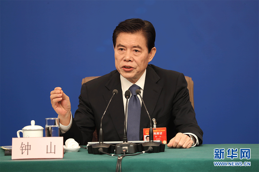 十三屆全國人大二次會議新聞中心3月9日(星期六)10時(shí)30分在梅地亞中心新聞發(fā)布廳舉行記者會,邀請商務(wù)部部長鐘山、副部長兼國際貿(mào)易談判副代表王受文、副部長錢克明就“促進(jìn)形成強(qiáng)大國內(nèi)市場 推動全方位對外開放”相關(guān)問題回答中外記者提問。圖為商務(wù)部部長鐘山。新華網(wǎng)/中國政府網(wǎng) 陳杰 攝