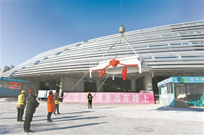 2019年12月31日,施工人員在國家速滑館施工現(xiàn)場起吊最后一塊待安裝的屋面單元板塊。項目建設(shè)方有關(guān)負責(zé)人表示,國家速滑館“冰絲帶”能如期實現(xiàn)“絲帶飛舞”,離不開強有力的監(jiān)督。新華社記者 鞠煥宗 攝
