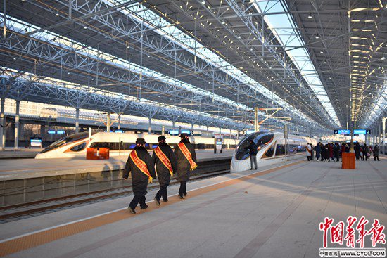 12月30日,北京至張家口高速鐵路開(kāi)通運(yùn)營(yíng),京張高鐵設(shè)計(jì)時(shí)速350公里,全線(xiàn)設(shè)北京北、清河、沙河(不辦理客運(yùn))、昌平、八達(dá)嶺長(zhǎng)城、東花園北、懷來(lái)、下花園北、宣化北、張家口10座車(chē)站。京張高鐵是我國(guó)首條智能化高速鐵路,也是2022年冬奧會(huì)的“門(mén)戶(hù)工程”。北京北站站臺(tái),三名站務(wù)人員走向一輛即將發(fā)車(chē)的京張高鐵列車(chē)。 實(shí)習(xí)生 宋欣然/攝