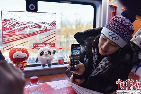 一名乘客正在拍攝2022年北京冬奧會(huì)吉祥物和車(chē)窗上的窗花。這些剪紙窗花是由張家口蔚縣剪紙藝人創(chuàng)作,包含了詹天佑畫(huà)像、京張高鐵和冰雪運(yùn)動(dòng)等元素。實(shí)習(xí)生 宋欣然/攝