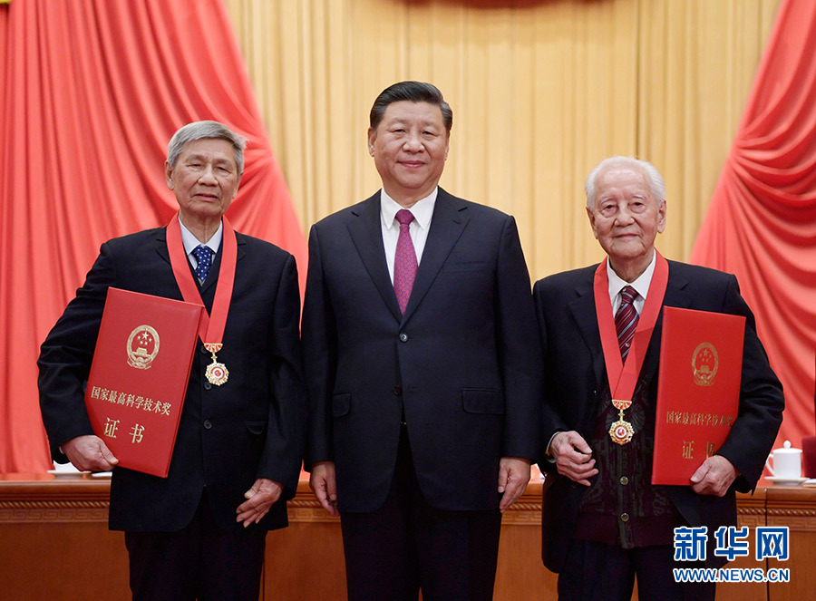 1月10日,2019年度國家科學(xué)技術(shù)獎勵大會在北京人民大會堂隆重舉行。中共中央總書記、國家主席、中央軍委主席習(xí)近平向獲得2019年度國家最高科學(xué)技術(shù)獎的原中國船舶重工集團(tuán)公司第七一九研究所黃旭華院士(右)和中國科學(xué)院大氣物理研究所曾慶存院士(左)頒獎。 新華社記者 謝環(huán)馳 攝