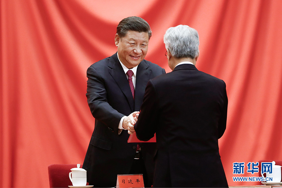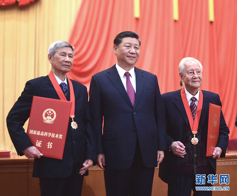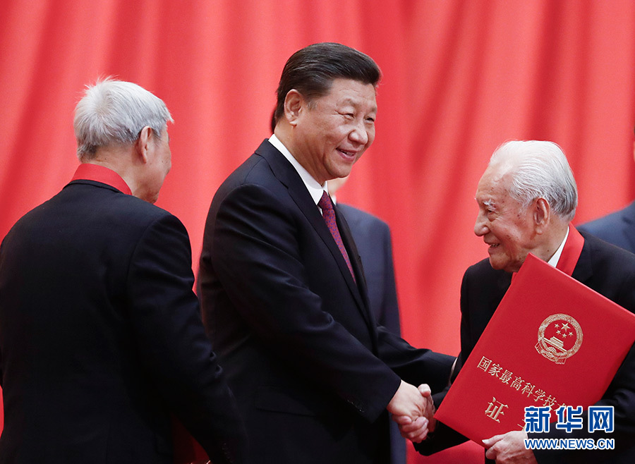 上午10時30分,大會在雄壯的國歌聲中開始。在熱烈的掌聲中,中共中央總書記、國家主席、中央軍委主席習(xí)近平首先向獲得2019年度國家最高科學(xué)技術(shù)獎的原中國船舶重工集團(tuán)公司第七一九研究所黃旭華院士和中國科學(xué)院大氣物理研究所曾慶存院士頒發(fā)獎?wù)?、證書,同他們熱情握手表示祝賀,并請他們到主席臺就座。隨后,習(xí)近平等黨和國家領(lǐng)導(dǎo)人同兩位最高獎獲得者一道,為獲得國家自然科學(xué)獎、國家技術(shù)發(fā)明獎、國家科學(xué)技術(shù)進(jìn)步獎和中華人民共和國國際科學(xué)技術(shù)合作獎的代表頒發(fā)證書。