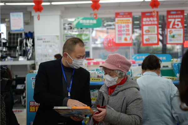 1月23日,在長沙一家老百姓大藥房內,店員向市民介紹不同類型的口罩。當日,長沙不少市民來到藥店購買口罩。長沙連鎖藥企老百姓大藥房質量負責人表示,為使市民都能買到口罩,防止囤貨,每位進店市民限購五份口罩;自新型冠狀病毒感染的肺炎疫情發(fā)生以來,店內口罩價格沒有變化。新華社發(fā)(陳振海 攝)
