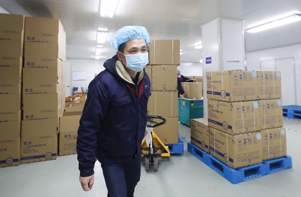 1月23日,在浙江省德清縣湖州莫干山高新技術產業(yè)開發(fā)區(qū)一口罩公司生產車間,工作人員在拉運成箱的口罩。近日,各地口罩生產企業(yè)克服春節(jié)期間用工困難,抓緊生產,全力增加市場供應。新華社發(fā)(王正攝)
