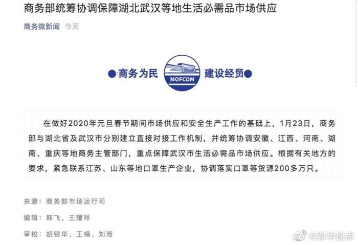 記者從商務部了解到,23日,商務部統籌協調安徽、江西、河南、湖南、重慶等地商務主管部門,重點保障武漢市生活必需品市場供應。根據有關地方的要求,緊急聯系江蘇、山東等地口罩生產企業(yè),協調落實口罩等貨源200多萬只。(記者王雨蕭、陳煒偉)?