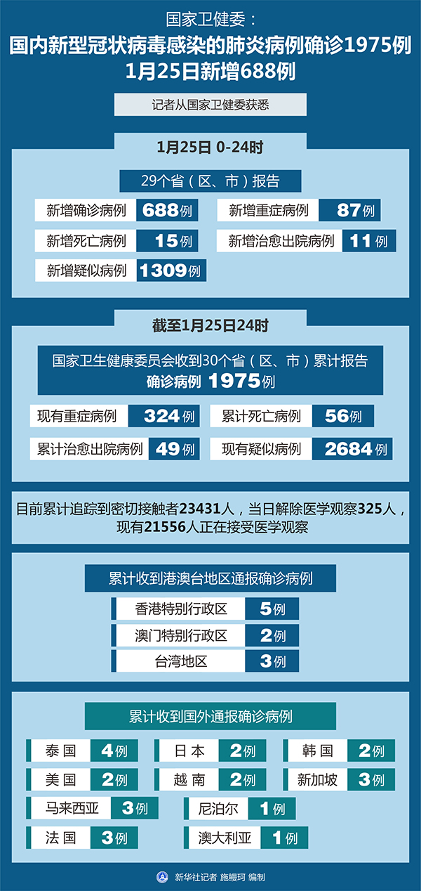 圖表:國家衛(wèi)健委:國內新型冠狀病毒感染的肺炎病例確診1975例 1月25日新增688例 新華社記者 施鰻珂 編制
