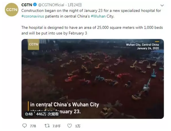 昨晚,CGTN在推特發(fā)布的一條關于武漢火神山醫(yī)院工地施工現場的視頻一舉沖上該平臺國際新聞首頁熱門,觀看量超446萬,超過153萬的全球網友參與互動。